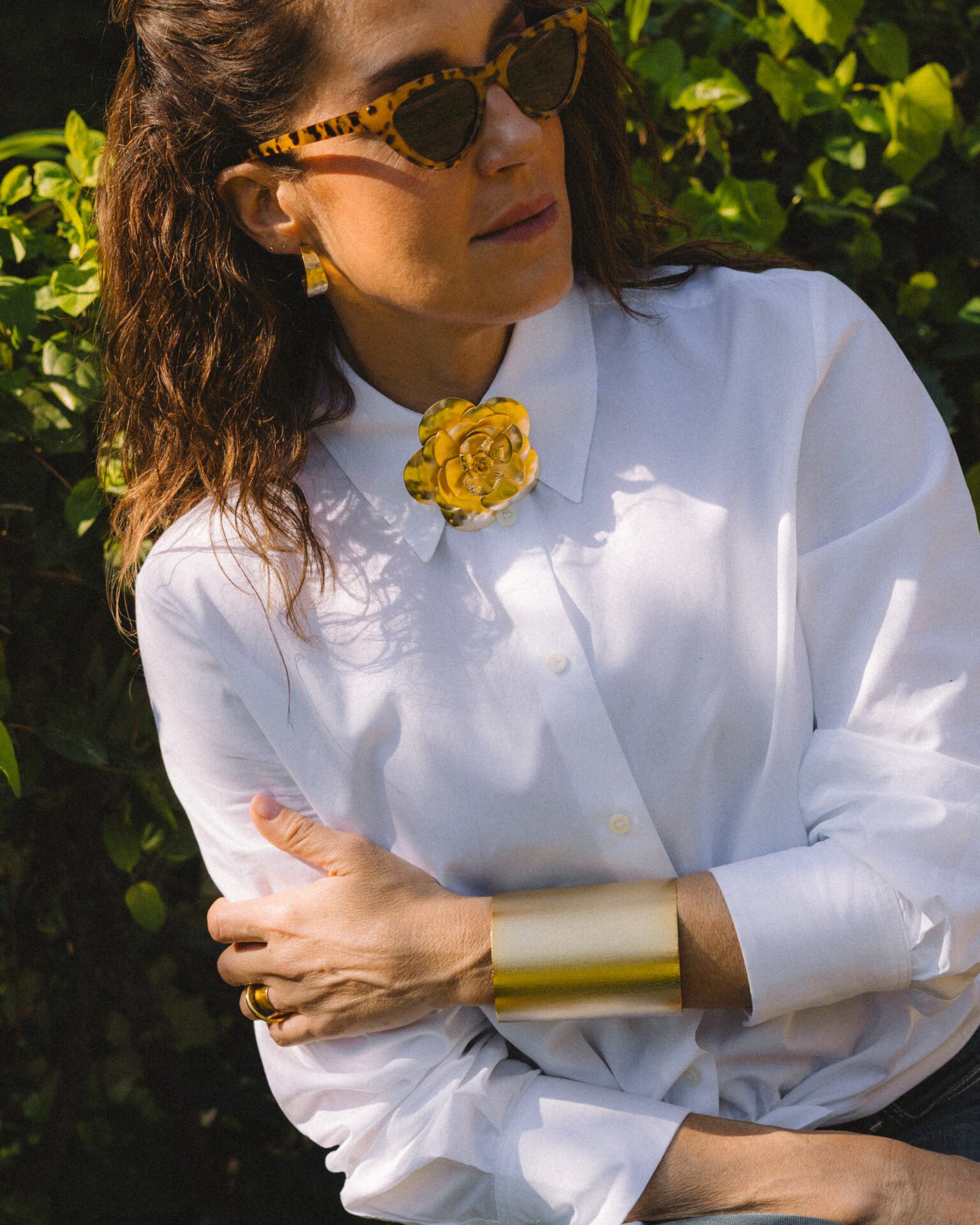 Esclava ancha de latón chapado en oro.