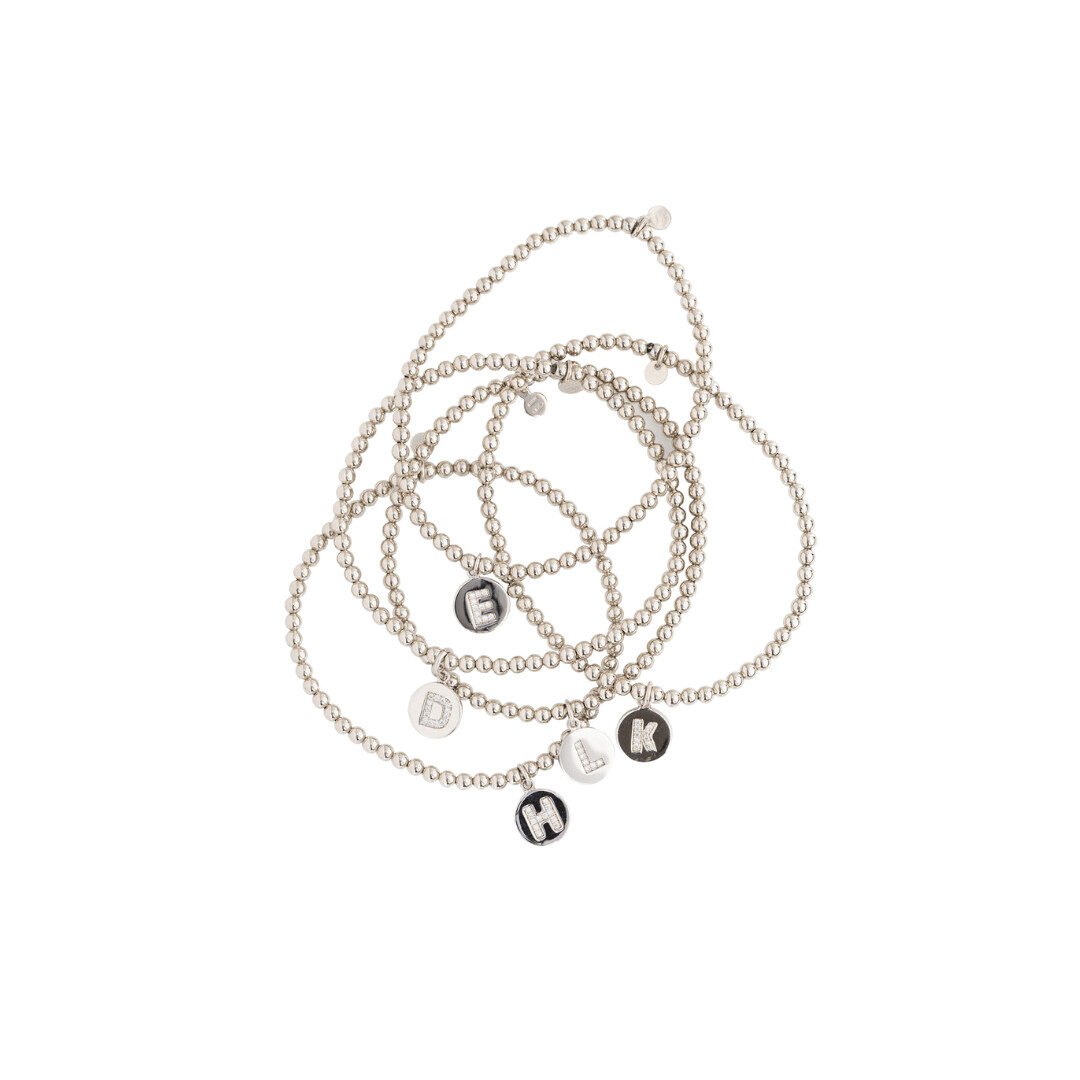 Pulsera de bolitas de plata rodiada hecha con silicona elástica, con plaquita colgante de plata de…